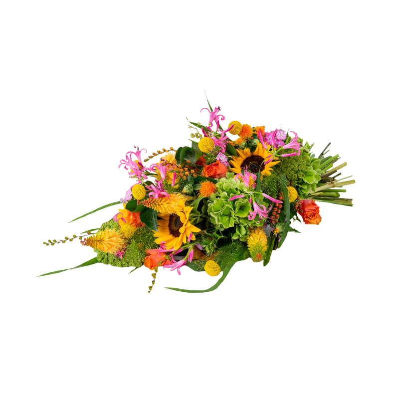 Een hand gebonden rouwboeket samengesteld van bloemen uit de natuur. Verkrijgbaar in 5 verschillende maten. Een rouw-arrangement kan en mag, op basis van beschikbaarheid en seizoen, afwijken van de getoonde soorten op de foto.